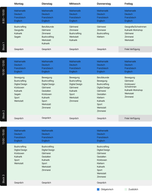 Mit jedem Kind gemeinsam wird der individuelle Stundenplan zusammengestellt. Dieser besteht aus den obligatorischen Fächern, wo die Kinder gemäss Stufe und Lehrplan, jedoch in ihrem Tempo und anhand ihren individuellen Begabungen, unterrichtet werden. Die Wahlfächer sind so konzipiert, dass Wissen vermittelt wird und Bewegung, handwerkliches Geschick, Harmonie mit der Natur oder die Freude an den Geschmäckern gefördert wird. Dies ohne Druck und im Gleichklang mit dem Entwicklungsstand.